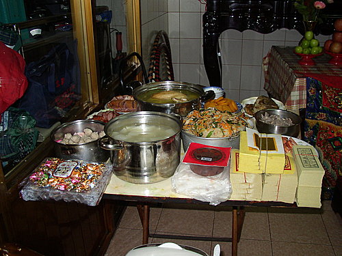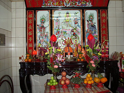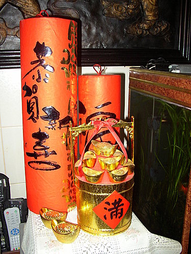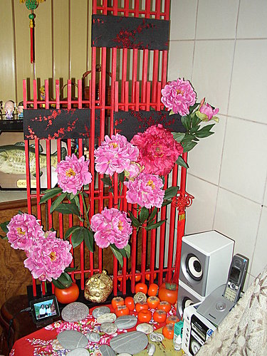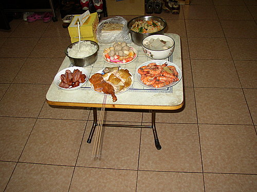 拜祖先與拜地基是今天的活動。 我老媽在拜祖先時, 還不斷唸唸有詞, 希望祖先保佑小弟夫婦倆快生小朋友, 而且還是要男丁, 以便延續黃家的香火....