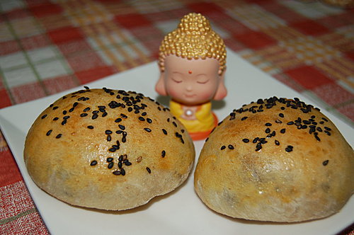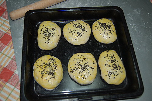 我的小小烤箱, 只能烤6個小麵包...., 每一個麵包都擦上蛋黃汁液, 再隨意撒了些黑芝麻!!!