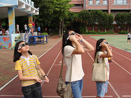 今天是天文的大日子---日全食。 雖然台灣只能看到日偏食, 還是積極參與一下此活動, 所以趁機向公司請年假, 一大早就叫醒小朋友, 免得睡過頭, 帶了三個小孩子到大理國小操場觀看日偏食!!