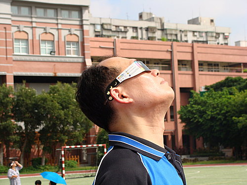有些人還特地站在司令台, 要搶個好位置看日食!!