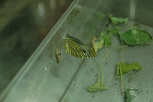 很快地, 6隻菜蟲都成蛹, 今天晚上第一隻紋白蝶已破蛹而出了, 它一直在飼養盒中拍翅飛舞, 一直急著要飛出去, 想照一張好看的照片都有困難, 而且又隔著飼養盒上的保鮮膜, 照起相都有些反光與模糊!!