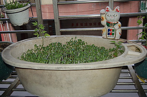 現在已改種芽菜, 滿滿的蘿蔔嬰, 其中還夾雜著1棵地瓜, 盆上由招財貓看守著, 不知那些鳥兒有沒有因此卻步!!