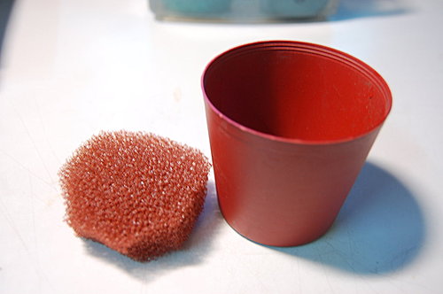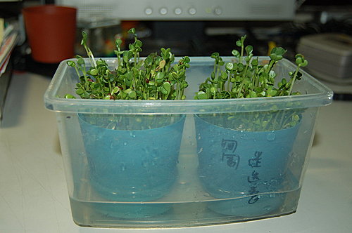 使用養魚用的過濾棉, 剪成適合大小, 然後放於3吋盆內, 當成可吸水的種植平台, 再鋪滿芽菜種子, 放置於有水的塑膠盒中, 如此便完成了水耕種植芽菜了!